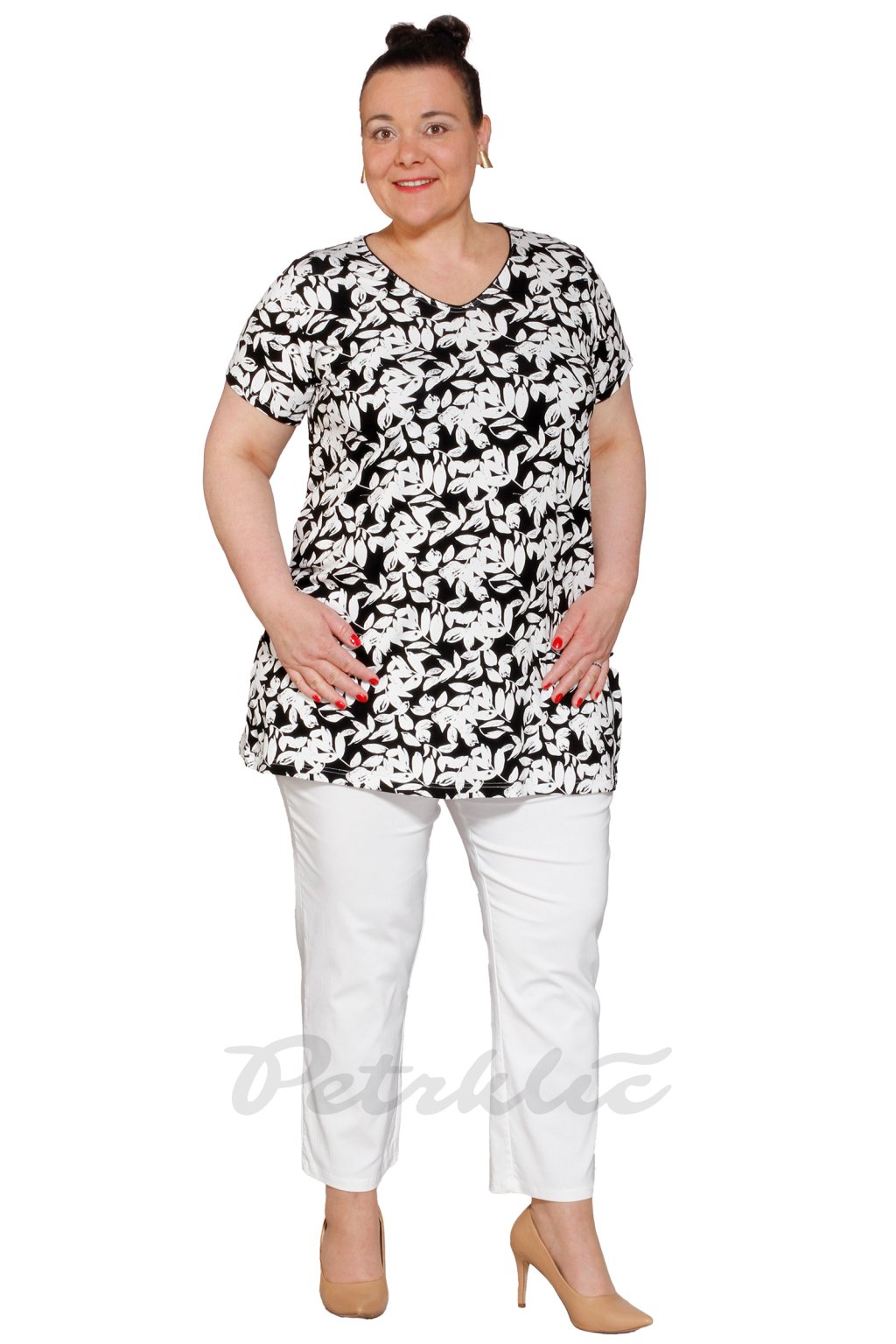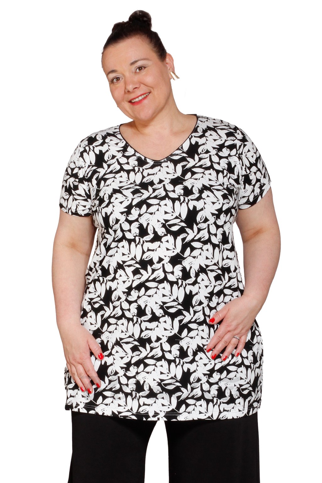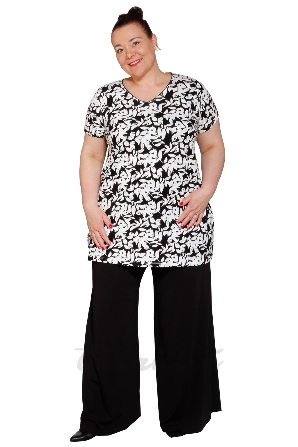 Áčková halenka Marie V bílé lístky na černé - s černými kalhotami