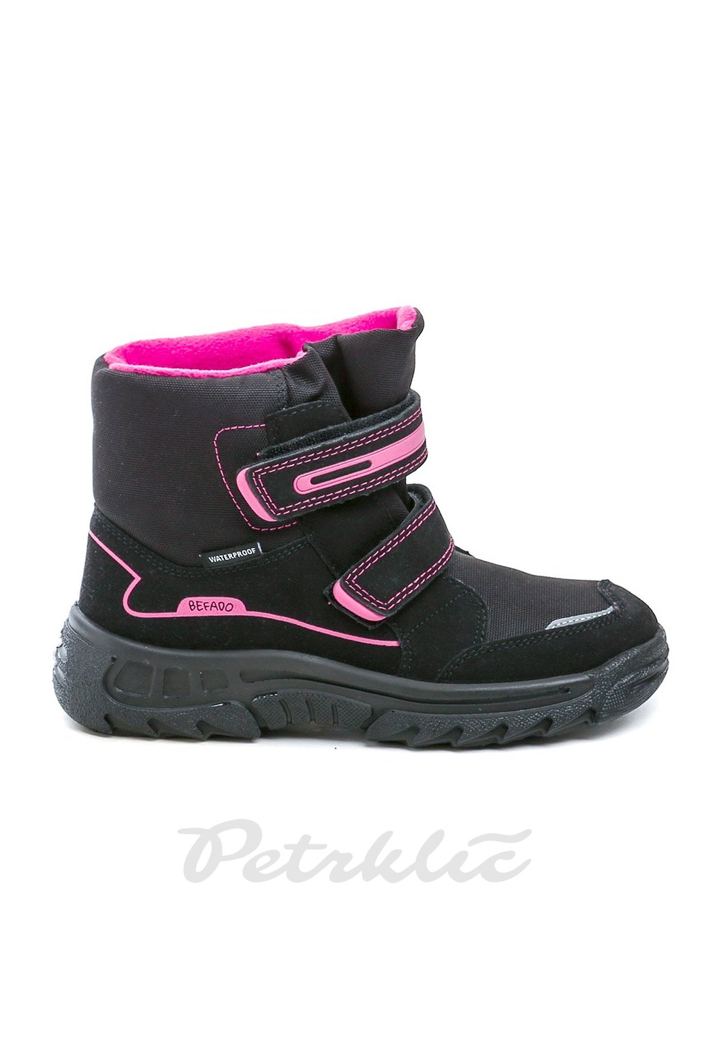 Dětská zimní vycházková kotníčková obuv se zapínáním na suchý zip.  Obuv je vyrobena z textilního materiálu v kombinaci s syntetickým materiálem. Vnitřní část obuvi je vybavena pěnovou textilní podšívkou, která tvoří zateplení. WATERPROOF - voděodolná úprava povrchu svršku. Váha jednoho páru: 580 g Dětské zimní kotníčkové boty.