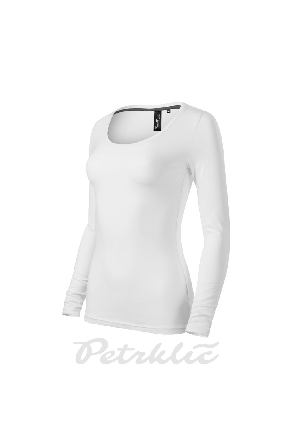 Strečový materiál udržující stálost tvaru, přiléhavý střih s bočními švy, hlubší kulatý výstřih, úzký lem průkrčníku z žebrového úpletu 1:1 s 5 % elastanu, vnitřní část průkrčníku začištěna kontrastní páskou, zpevnění ramenních švů páskou, dlouhé rukávy.
