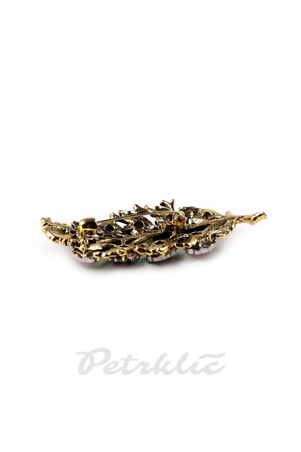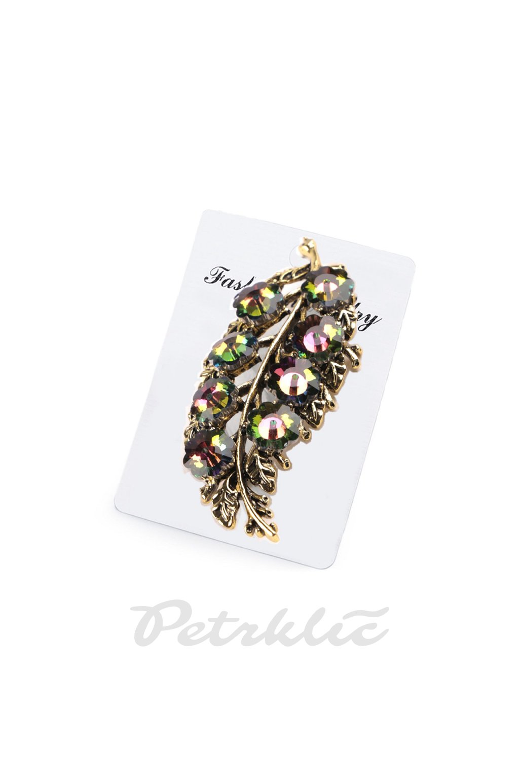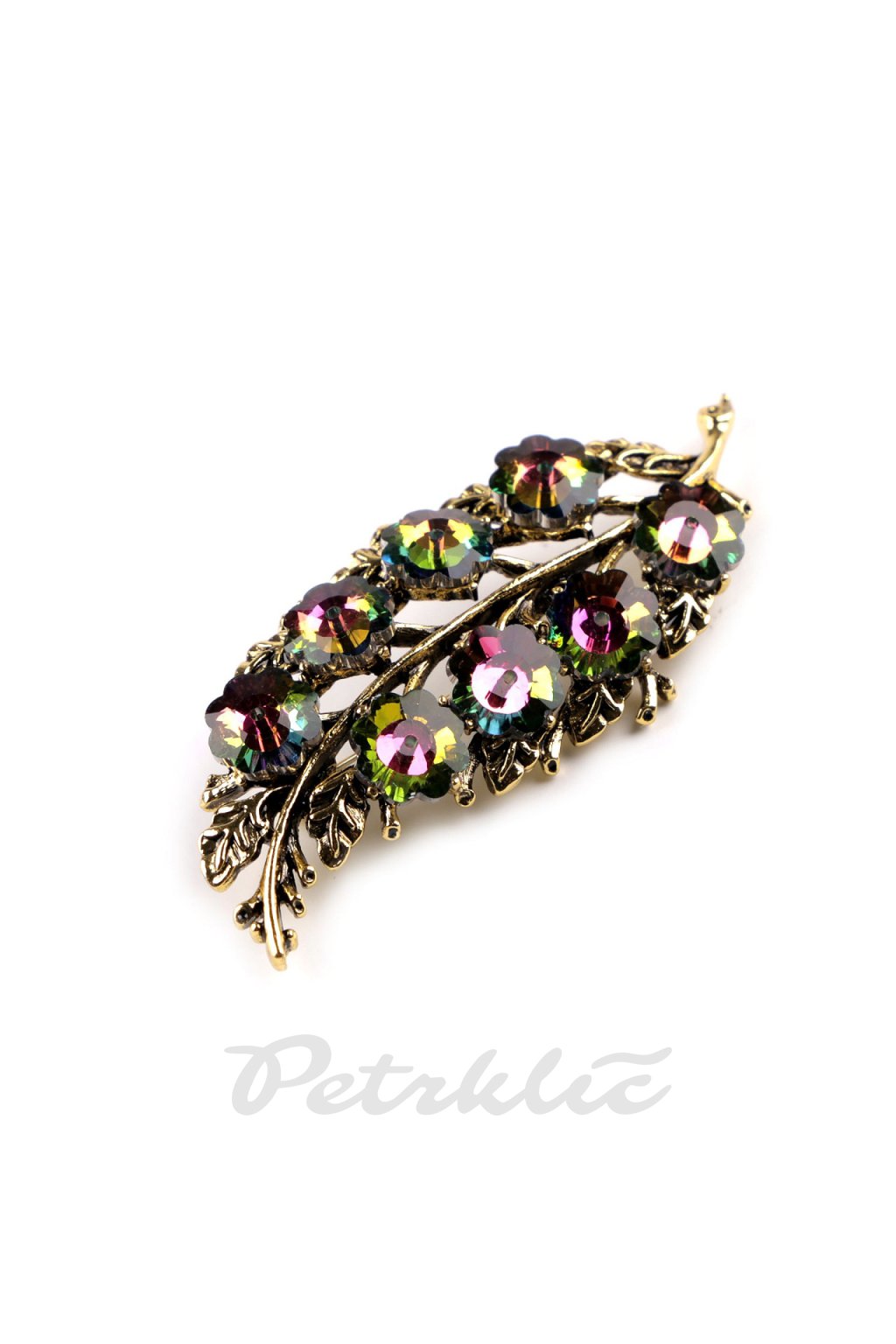 Vintage brož ve tvaru listu je osázená poutavými broušenými kamínky. Ze zadní strany má zavírací špendlík.
