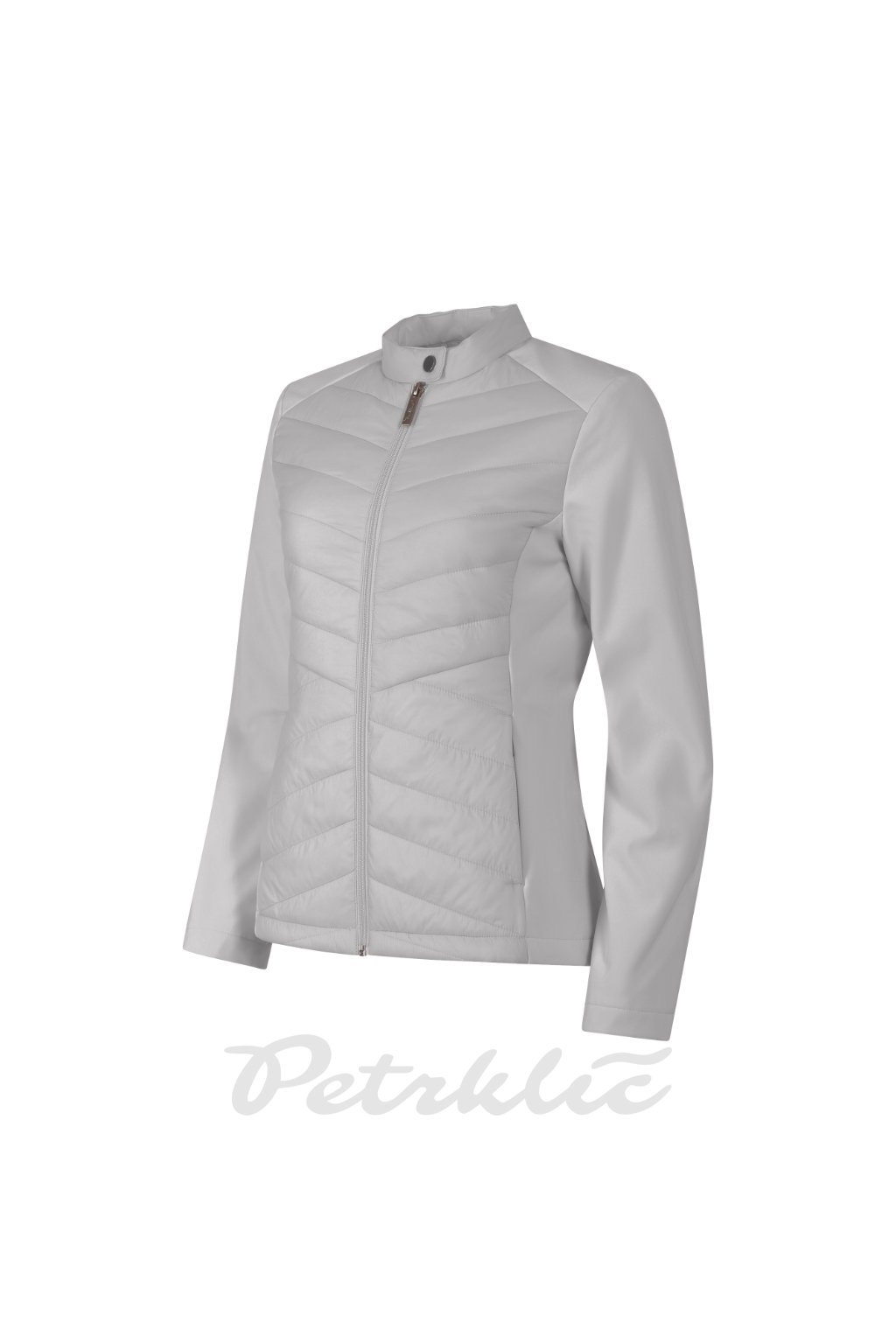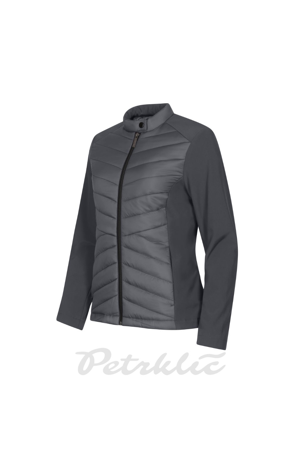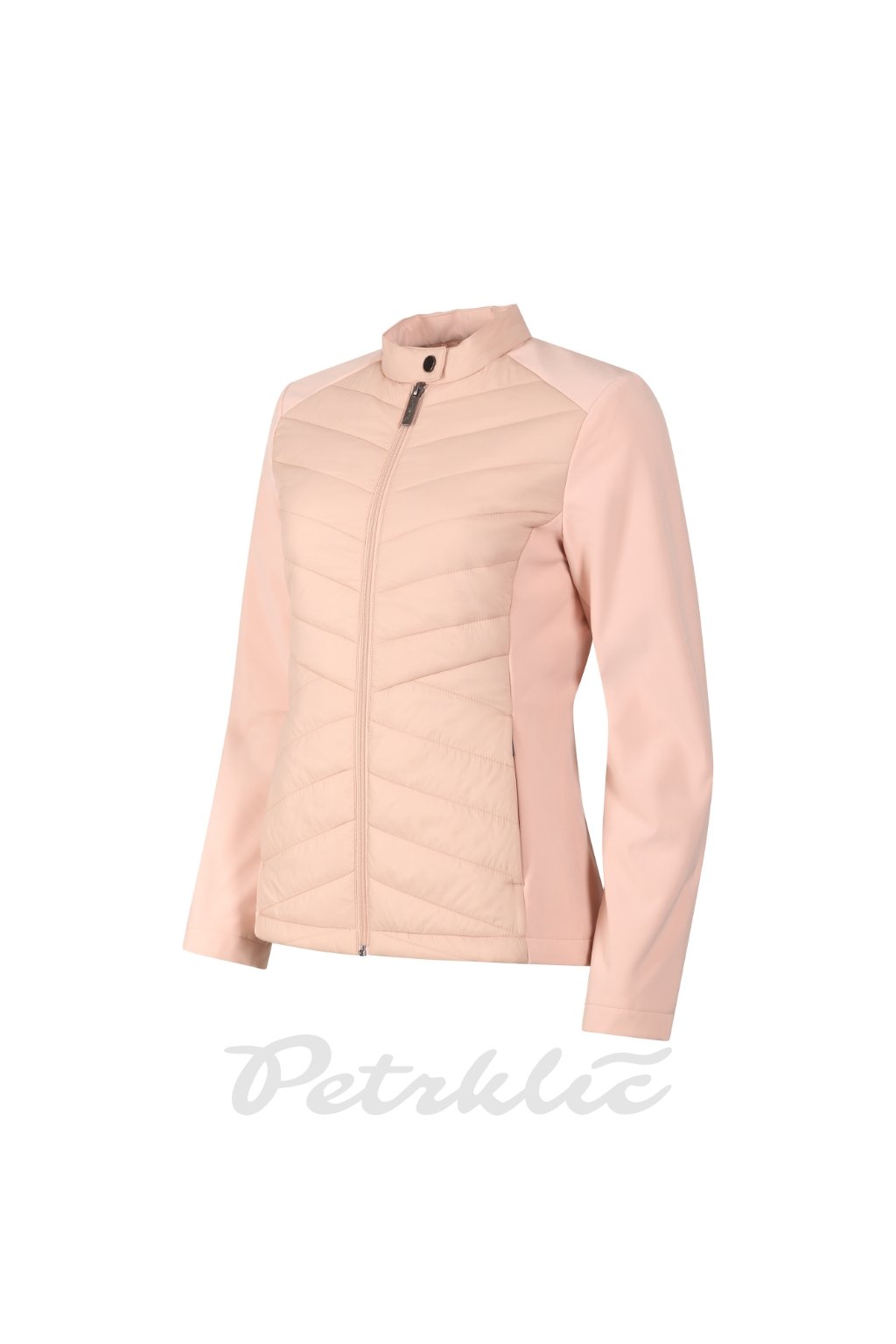 kombinace prošívaného a softshellového materiálu, střih tvarovaný bočními díly, stojáček na druk, celopropínací spirálový zip, boční kapsy se spirálovým zipem, vnitřní náprsní kapsa na zip, vstup pro branding v podšívce zadního dílu