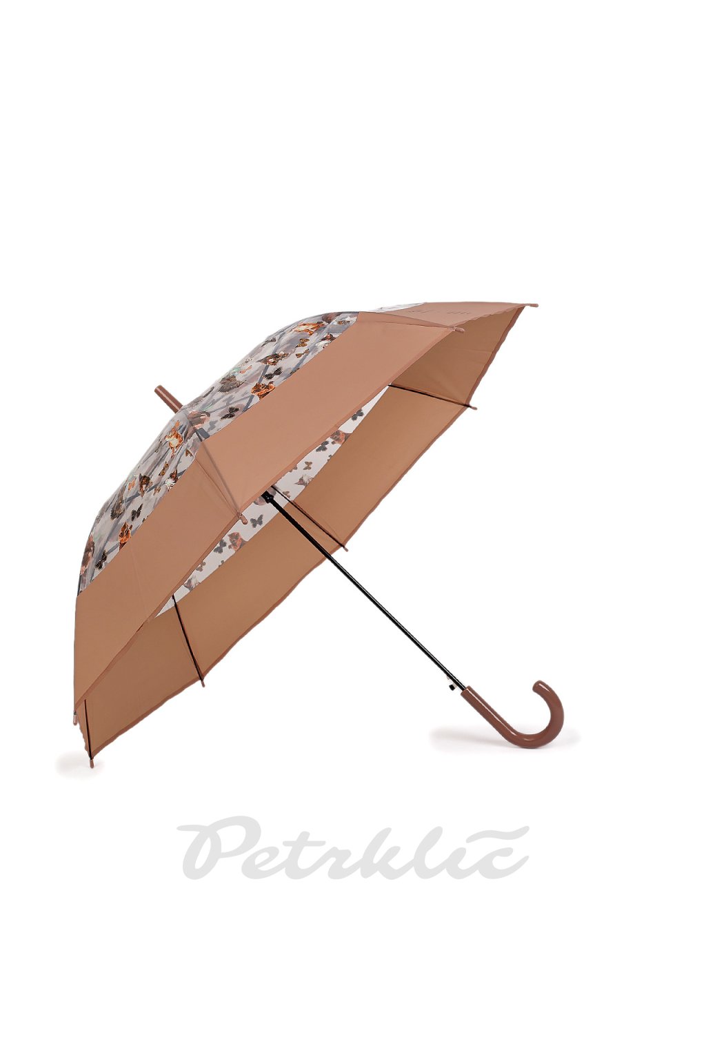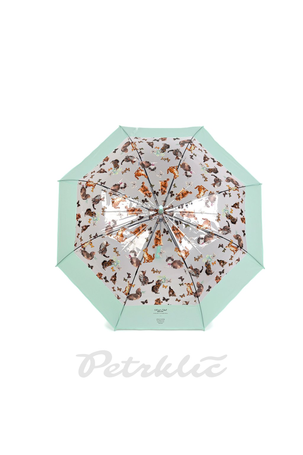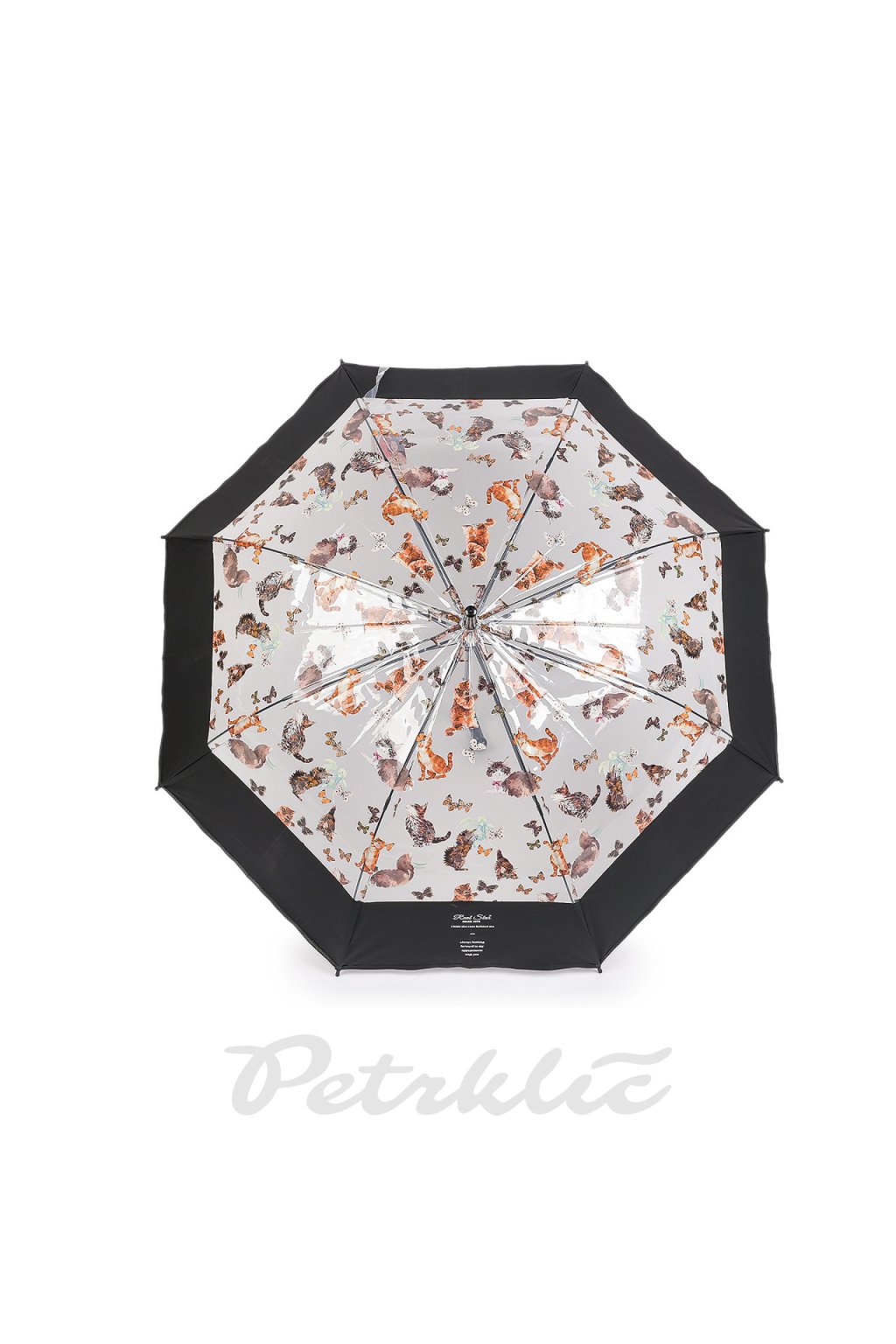 Průhledný deštník s barevným potiskem koček s motýly je ideální volbou pro všechny milovnice hravých módních doplňků. Je vystřelovací, okraj má ozdobený širokým barevným lemem. Konstrukce deštníku je z kovového drátu a pružných lamel, tvoří osm polí. Díky nim je velice pevný, neohne se ani za největšího nečasu. Klasická tyč je zakončená pevnou rukojetí.