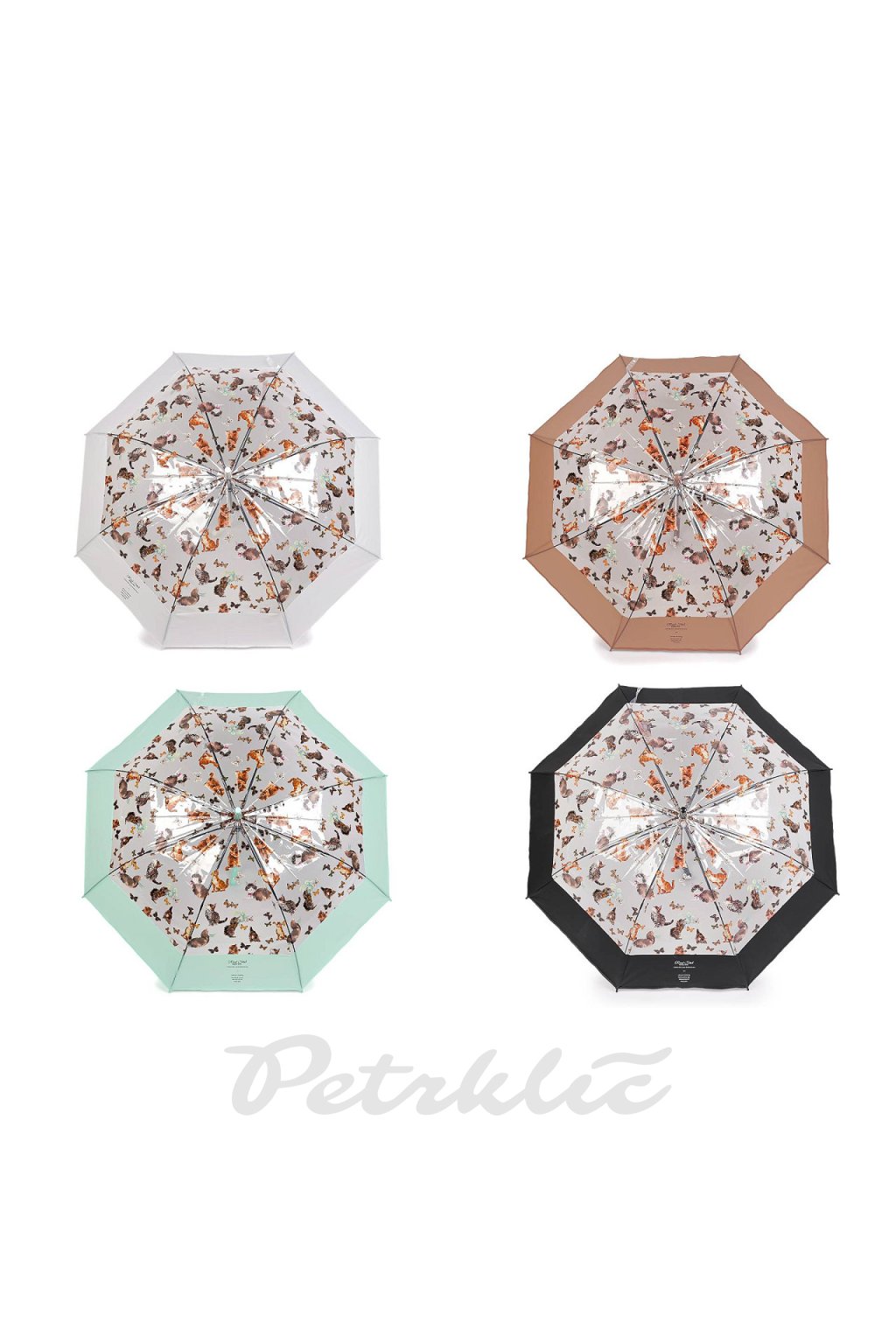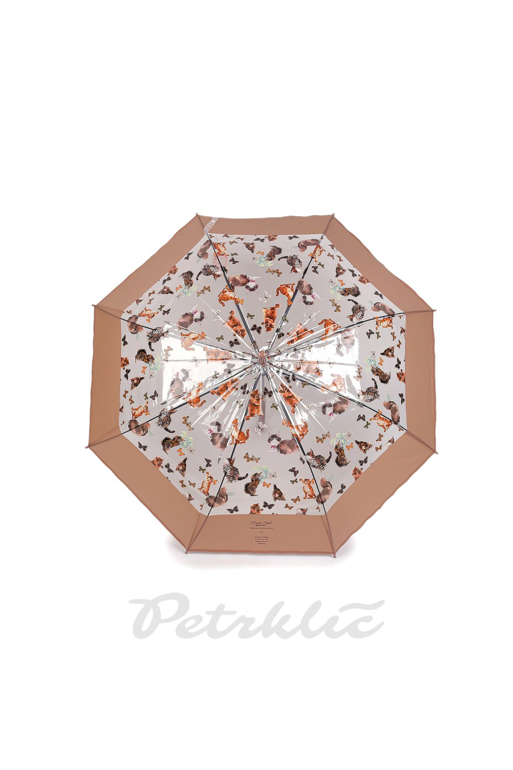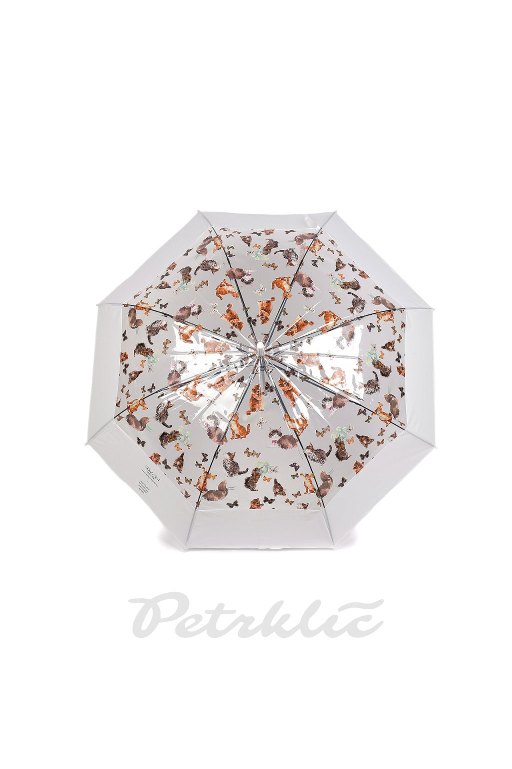 Průhledný deštník s barevným potiskem koček s motýly je ideální volbou pro všechny milovnice hravých módních doplňků. Je vystřelovací, okraj má ozdobený širokým barevným lemem. Konstrukce deštníku je z kovového drátu a pružných lamel, tvoří osm polí. Díky nim je velice pevný, neohne se ani za největšího nečasu. Klasická tyč je zakončená pevnou rukojetí.