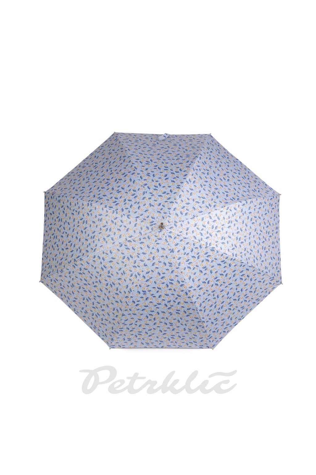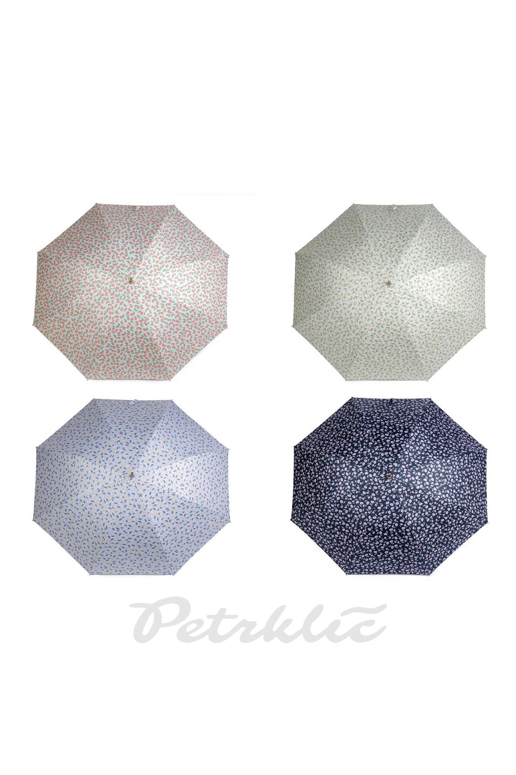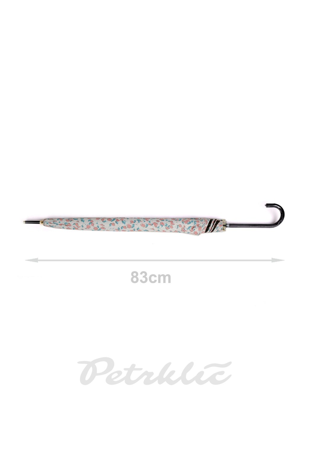 Velký dámský deštník s potiskem malých květů je vystřelovací, konstrukci má z kovového drátu a pružných lamel, které tvoří osm polí. Díky nim je velice pevný, neohne se ani za největšího nečasu. UV filtr vás ochrání před slunečním zářením. Klasická tyč je zakončená pevnou rukojetí z eko kůže. Dolní strana potahu je černá.