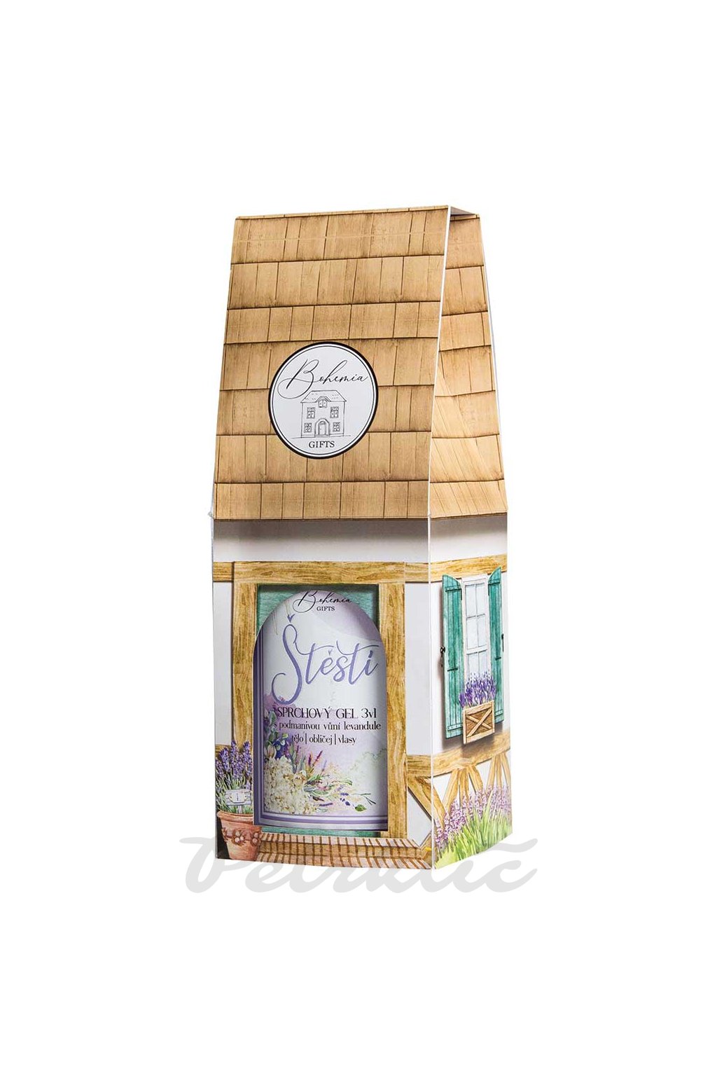 Luxusní sprchový gel v dárkové krabičce s vůní levandule 3v1 – na tělo, vlasy i ruce. Stylový obal ve tvaru domečku a nápisem ŠTĚSTÍ. Skvělý dárek pro vaše blízké nebo přímo pro Vás. Užívejte chvíle plné relaxace a kvalitní péče o vaší pokožku.