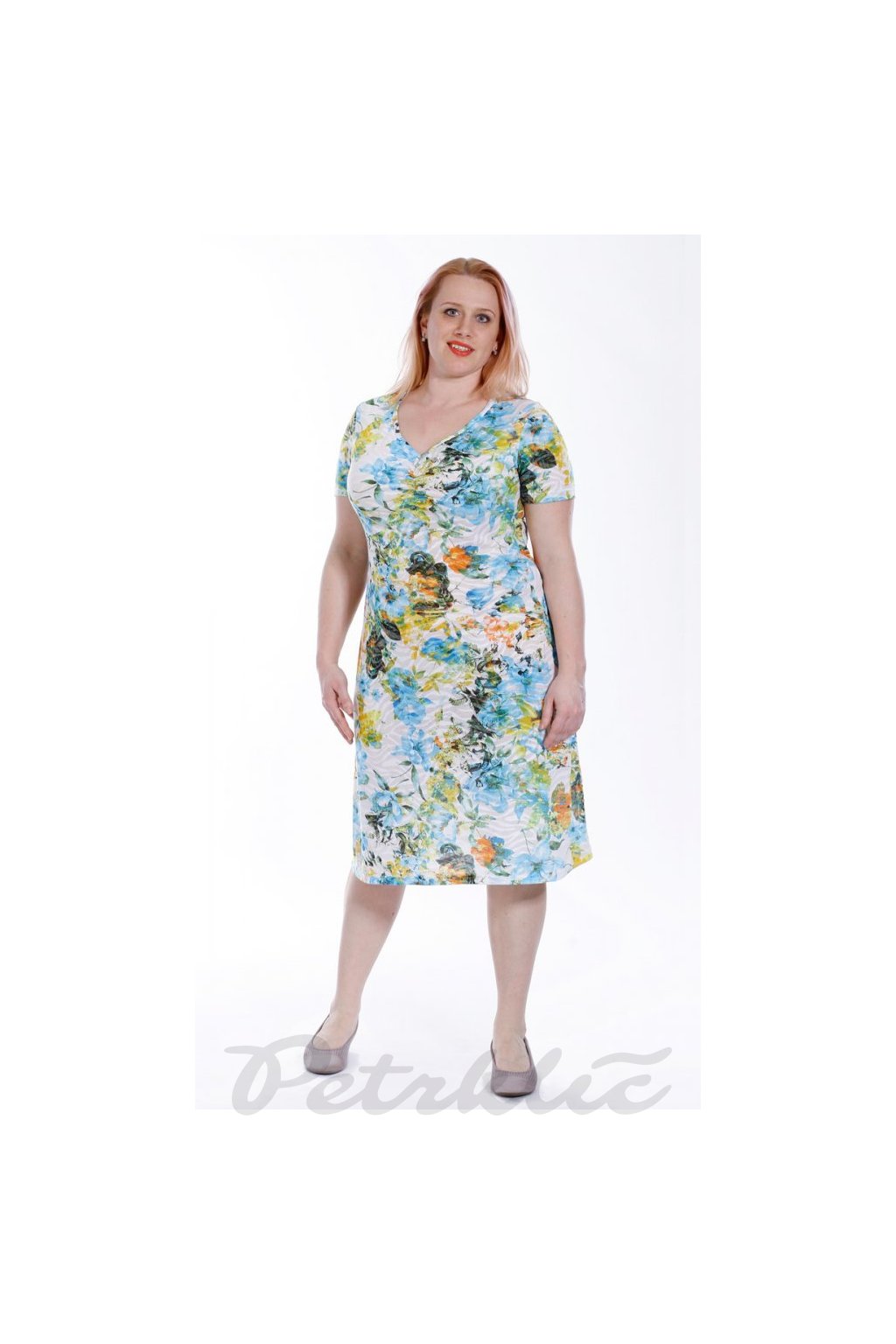 Tenčí šaty z příjemného materiálu s "V" výstřihem zřaseným do gumičky, krátkými rukávy a zajímavým vzorem.