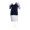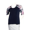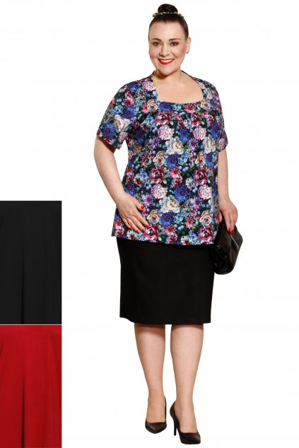 Kombinovaná halenka rovného střihu s ¾ nebo krátkými rukávy. Na předním díle členící švy s tiskem. Zadní díl hladký, celý v základní barvě. Materiál na vsadkách a rukávy jsou s decentním třpytem. Velice příjemný a zcela nemačkavý úpletový materiál.