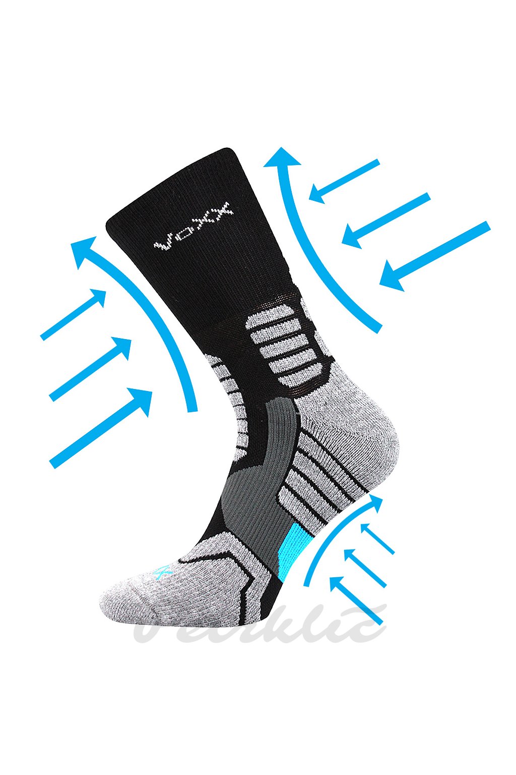dámské-pánské sportovní ponožky, kompresní, napomáhají pevnějšímu držení a vyšší stabilitě kotníku, se speciální konstrukcí proti posunu v botě, anatomicky tvarované a polstrované zóny chrání nohu proti otlakům a puchýřům, antibakteriální ochrana ionty stříbra v materiálu silproX, teplotní třída: B