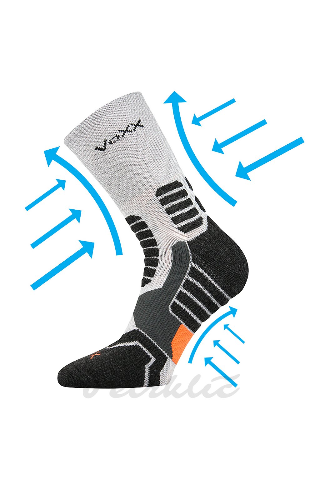 dámské-pánské sportovní ponožky, kompresní, napomáhají pevnějšímu držení a vyšší stabilitě kotníku, se speciální konstrukcí proti posunu v botě, anatomicky tvarované a polstrované zóny chrání nohu proti otlakům a puchýřům, antibakteriální ochrana ionty stříbra v materiálu silproX, teplotní třída: B