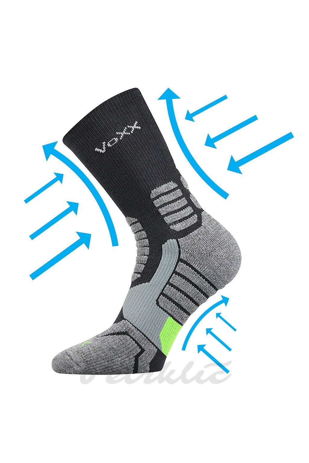dámské-pánské sportovní ponožky, kompresní, napomáhají pevnějšímu držení a vyšší stabilitě kotníku, se speciální konstrukcí proti posunu v botě, anatomicky tvarované a polstrované zóny chrání nohu proti otlakům a puchýřům, antibakteriální ochrana ionty stříbra v materiálu silproX, teplotní třída: B