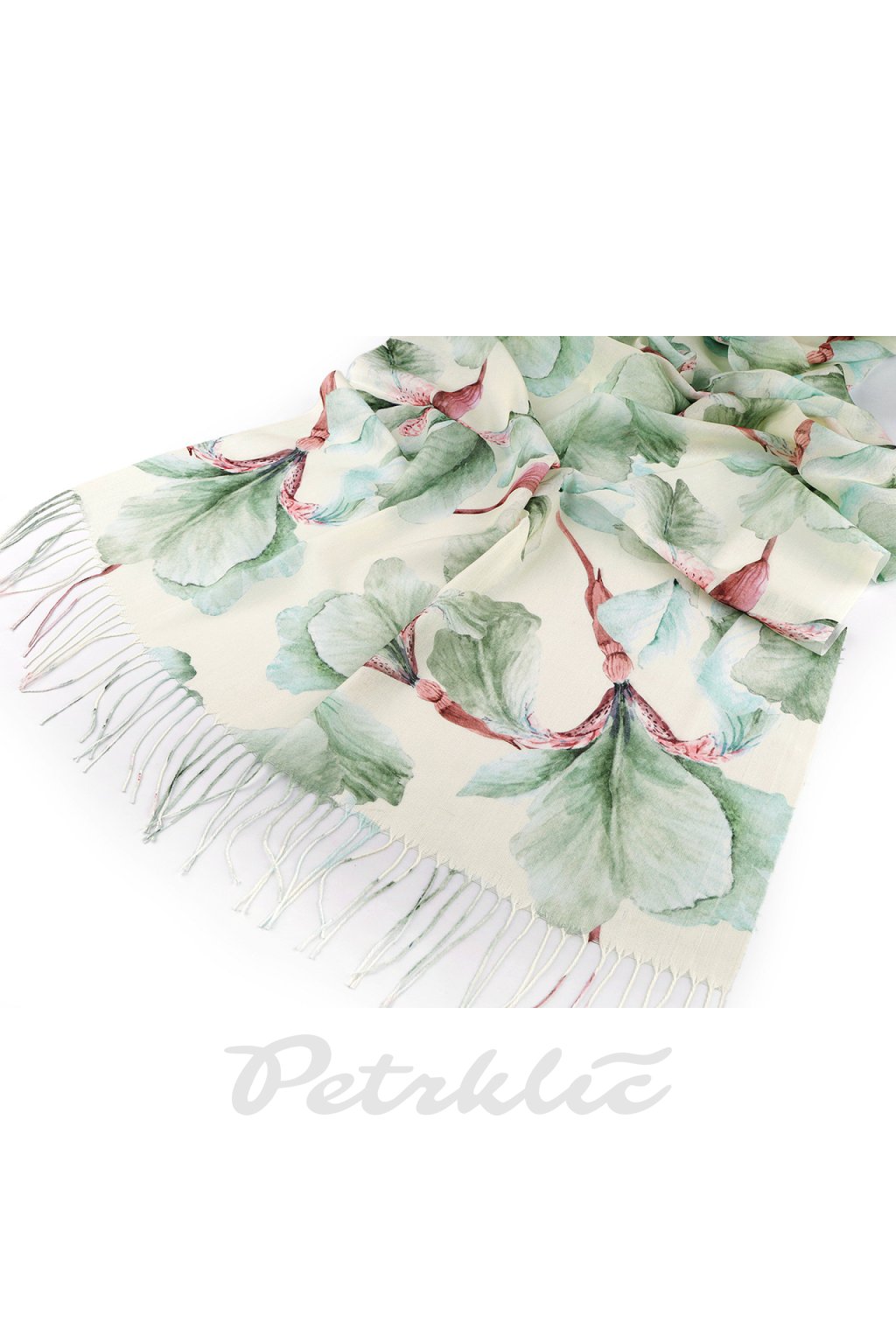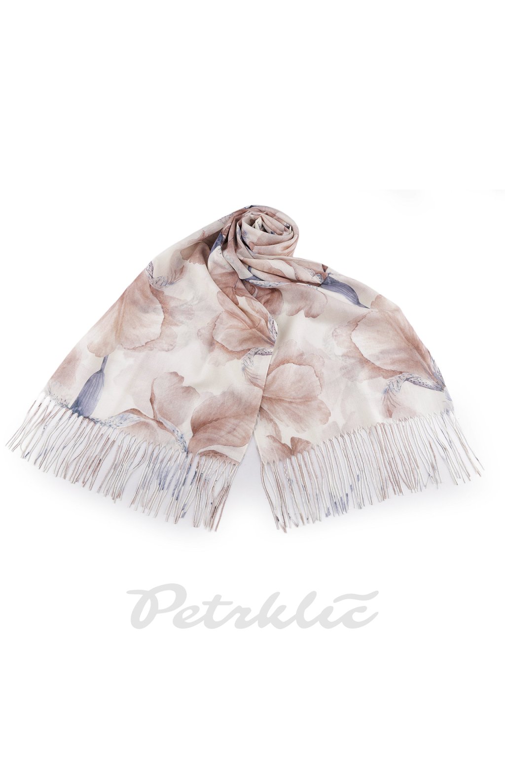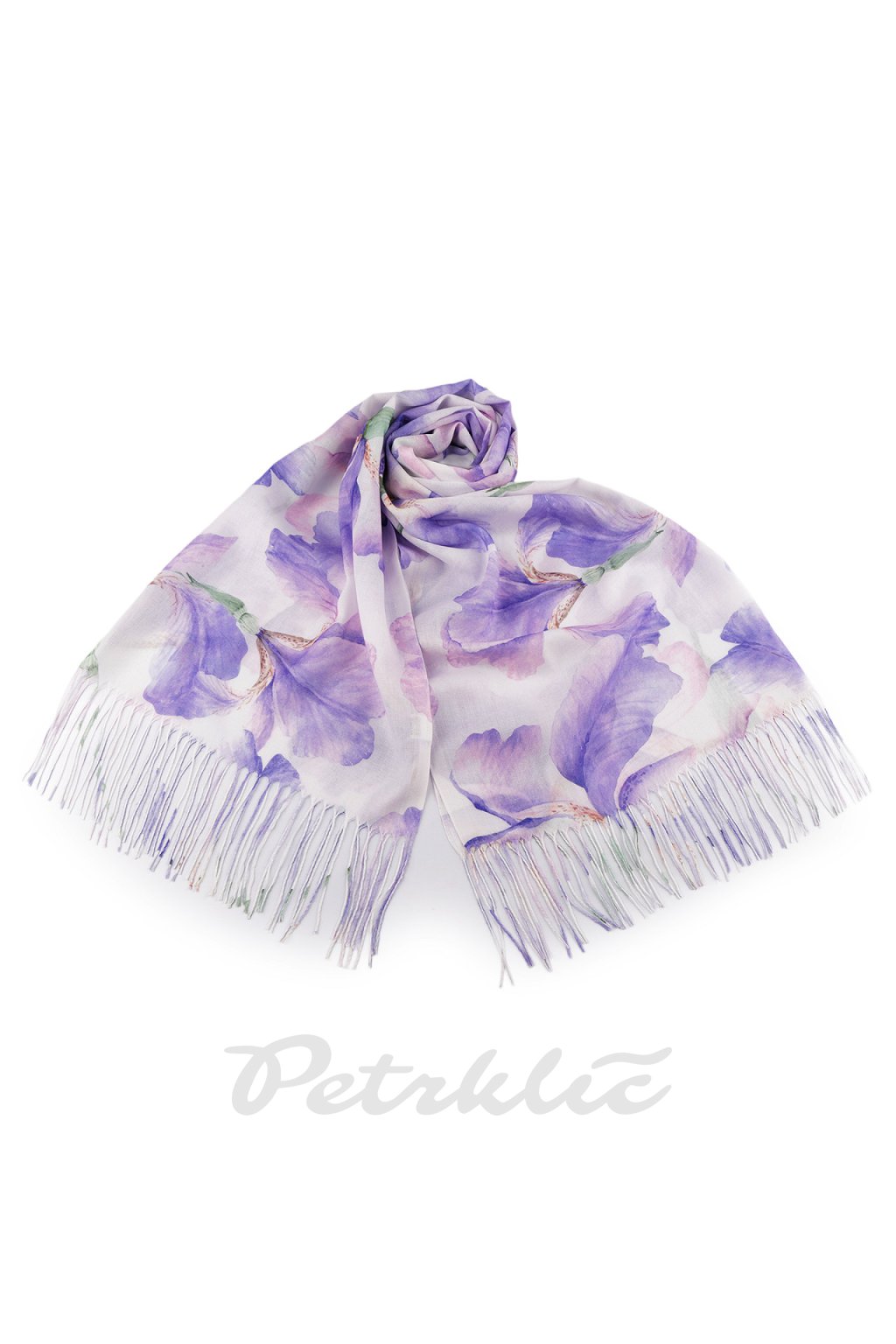 Šátek s motivem velkých květů kosatců je vzdušný a lehký, velice příjemný na dotek. Bude elegantním doplňkem pro každou příležitost. Je jemně průsvitný, na koncích má třásně. Doladí váš outfit, ať už si vezmete sako, halenku, svetřík či šaty.