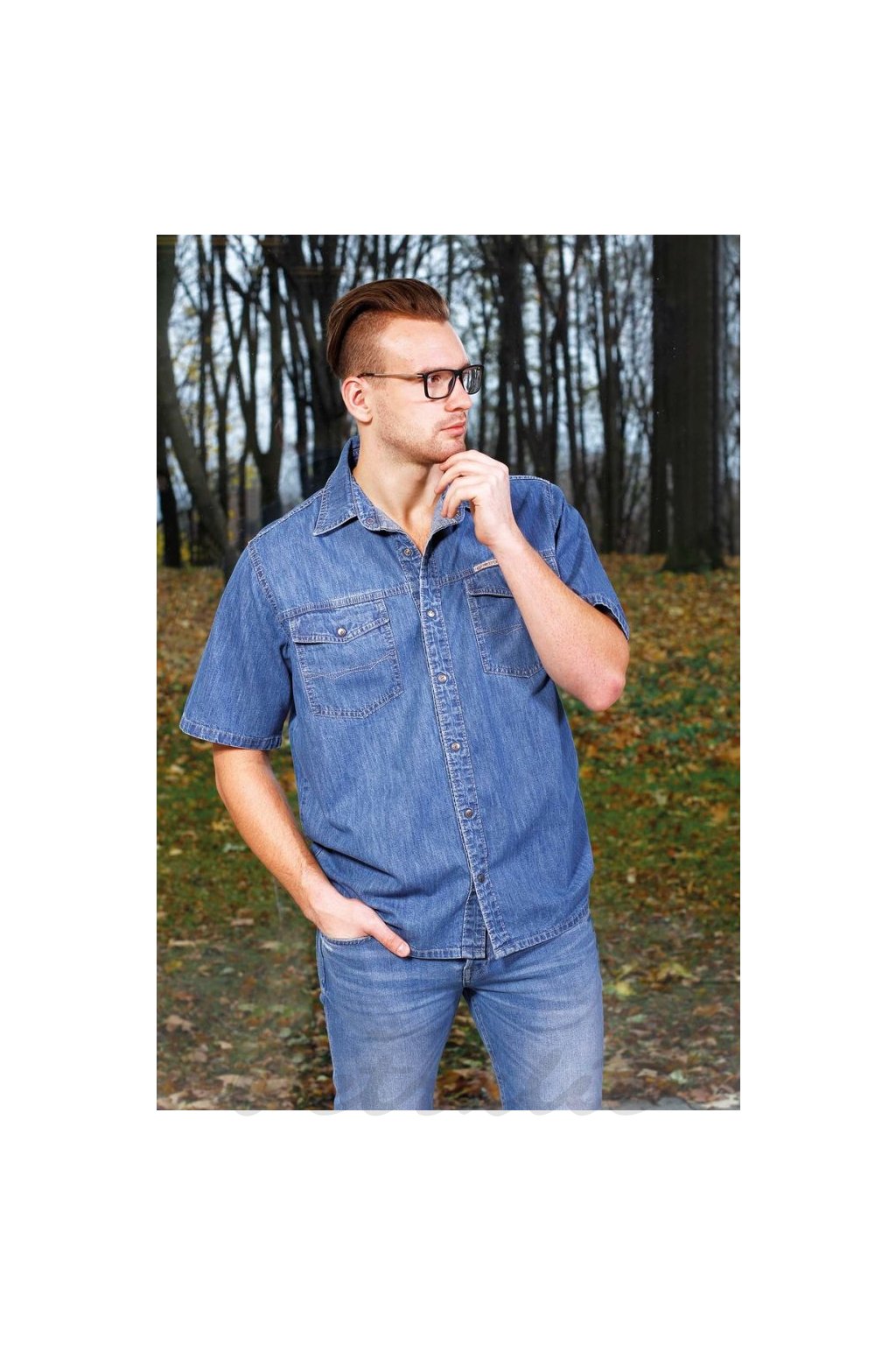 Pánská jeansová košile s krátkým rukávem ve světle modré barvě je ušita z kvalitní odlehčené italské rifloviny. Na předním díle jsou dvě nepostradatelné kapsy s patkami na malé patentky. Zadní díl zdobí sedlo. Košile se zapíná na řadu malých druků.