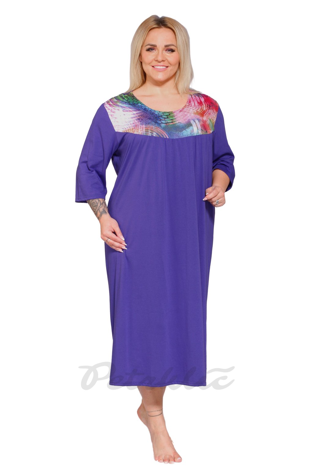 Dámská noční košile nebo také pohodlné domácí šaty. Přední díl je s lehkým řasením všitý do sedla. Zadní díl je v základní barvě, zcela hladký.