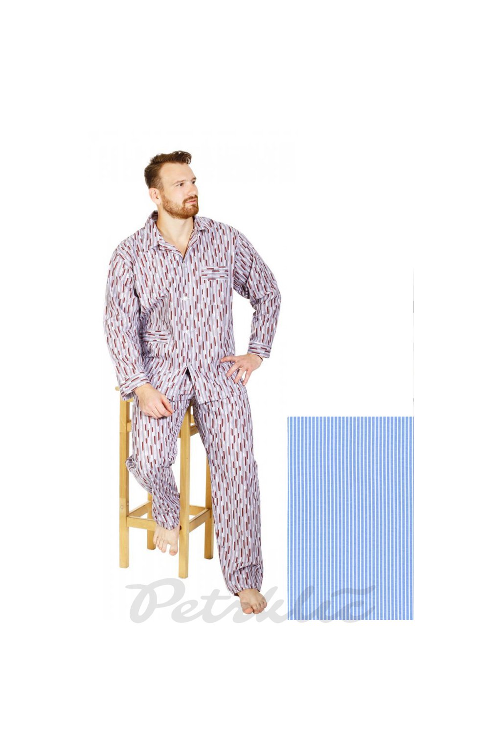 Klasické pánské pyžamo z kvalitního bavlněného plátna. Kabátek je se zapínáním ke krku a po bocích jsou dvě kapsy.