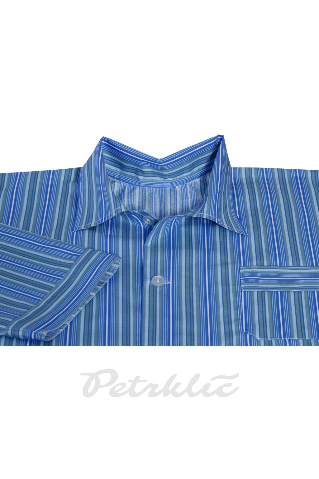 Klasické pánské pyžamo z kvalitního bavlněného plátna. Kabátek je se zapínáním ke krku a po bocích jsou dvě kapsy. Nabízíme v dlouhém provedení nebo s krátkými rukávy a krátkými nohavicemi. Tisk nemusí přesně odpovídat vyobrazenému. Šijeme různé modré dezény.