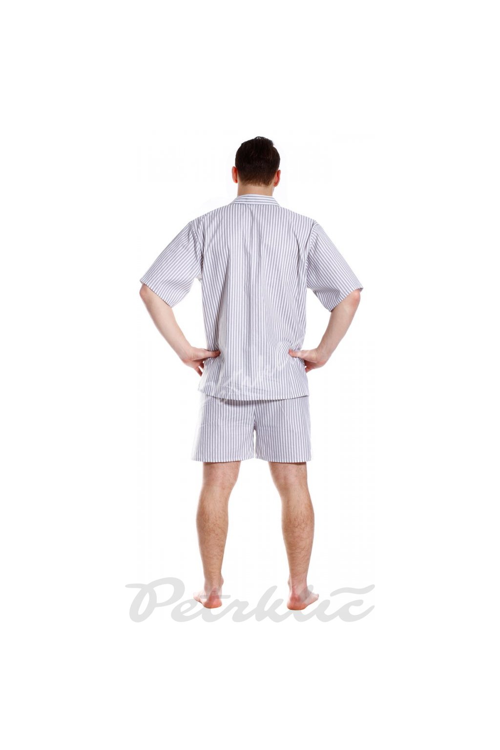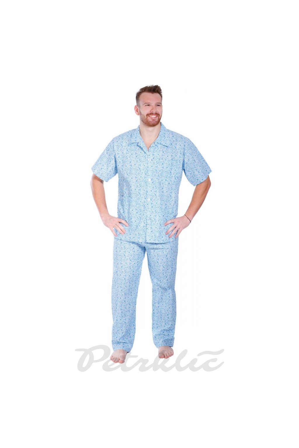 Klasické pyžamo z bavlněného plátna. Propínací kabátek s krátkými rukávy, doplněný krátkými kalhotami v délce 50 - 55 cm nebo dlouhými kalhotami 100 - 112 cm - podle toho jak si vyberete. Pas u kalhot do gumy.