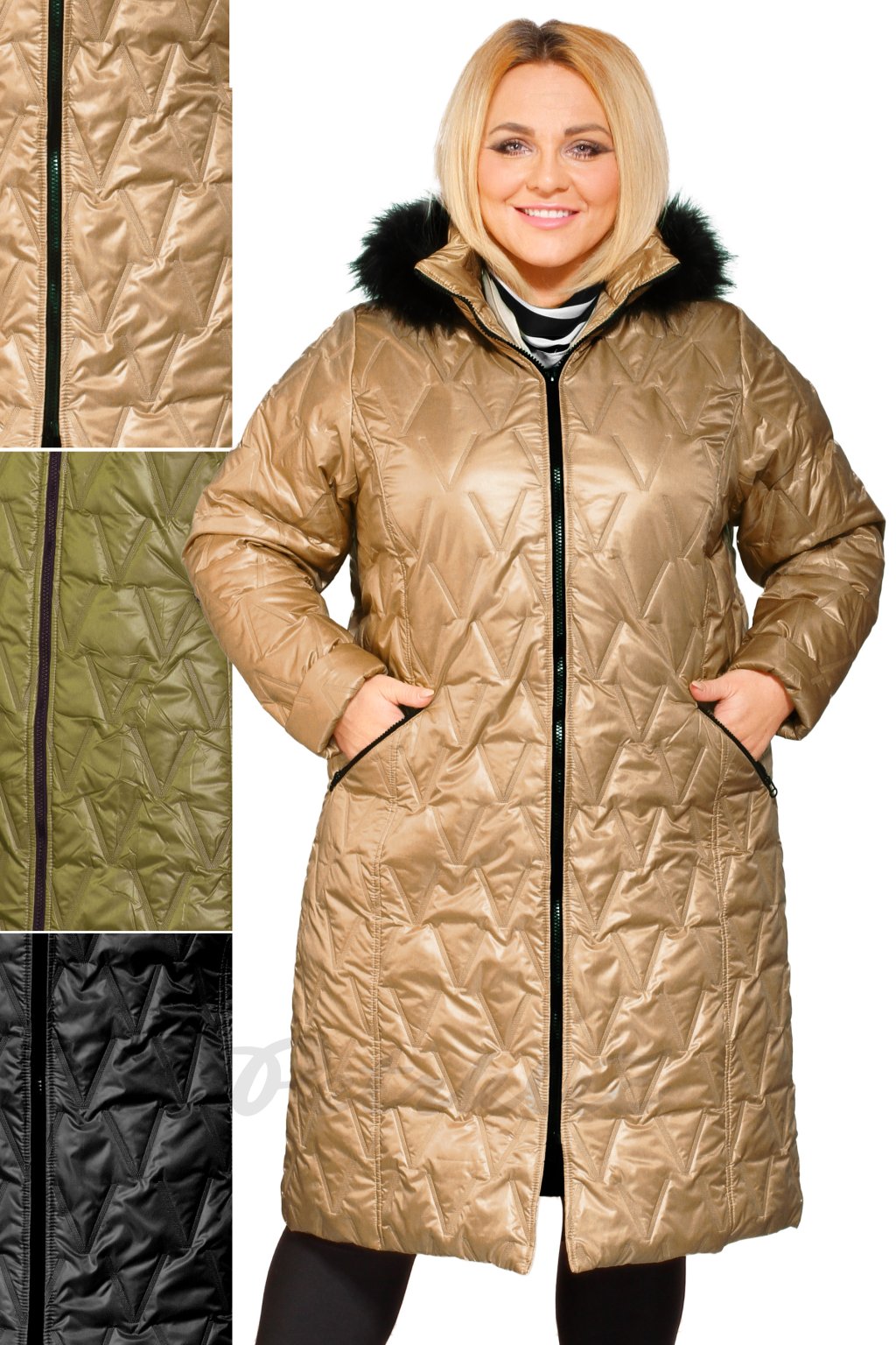 Zimní bunda s "protláčeným" véčkovým tvarem s černou hřejivou podšívkou. Princesový střih na předním i zadním díle tvaruje postavu. Dvoucestný zip, zipové kapsy a řešení kolem krku do stojáku s odnímatelnou kapucí. Kapuce je s hladkou černou umělou kožešinkou. Rukávy jsou ohrnovací!