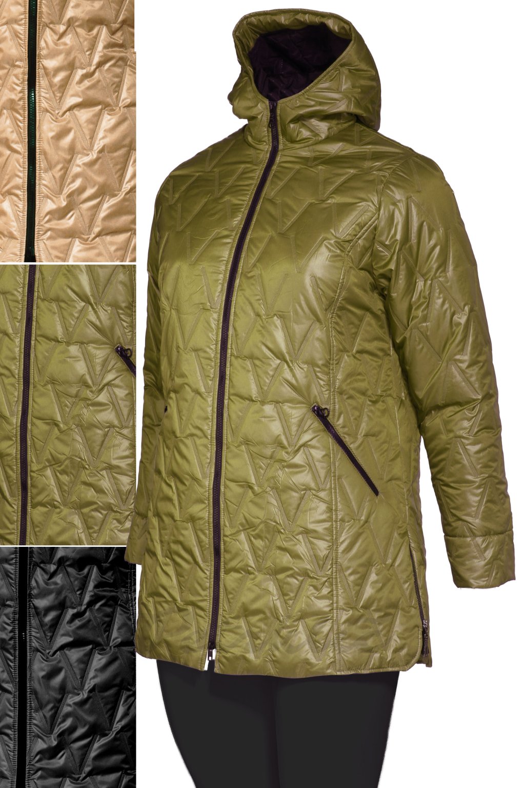 Zimní bunda s "protláčeným" véčkovým tvarem s černou hřejivou podšívkou. Princesový střih na předním i zadním díle tvaruje postavu. Dvoucestný zip, zipové kapsy a řešení kolem krku do stojáku s pevnou kapucí (neodnímatelnou). Po bocích v délce kratší zdobné funkční zipy pro pohodlnou chůzi. Rukávy jsou ohrnovací!