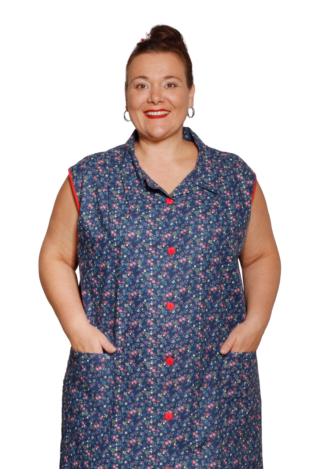 Bavlněná šatová zástěra u krku s límečkem, po stranách s našitými kapsami. Nabízíme ve dvou délkách. Můžete si nechat ušít i chňapku ve stejné barvě a nechat zabalit do dárkové krabičky. Chňapka není součástí této zástěry.