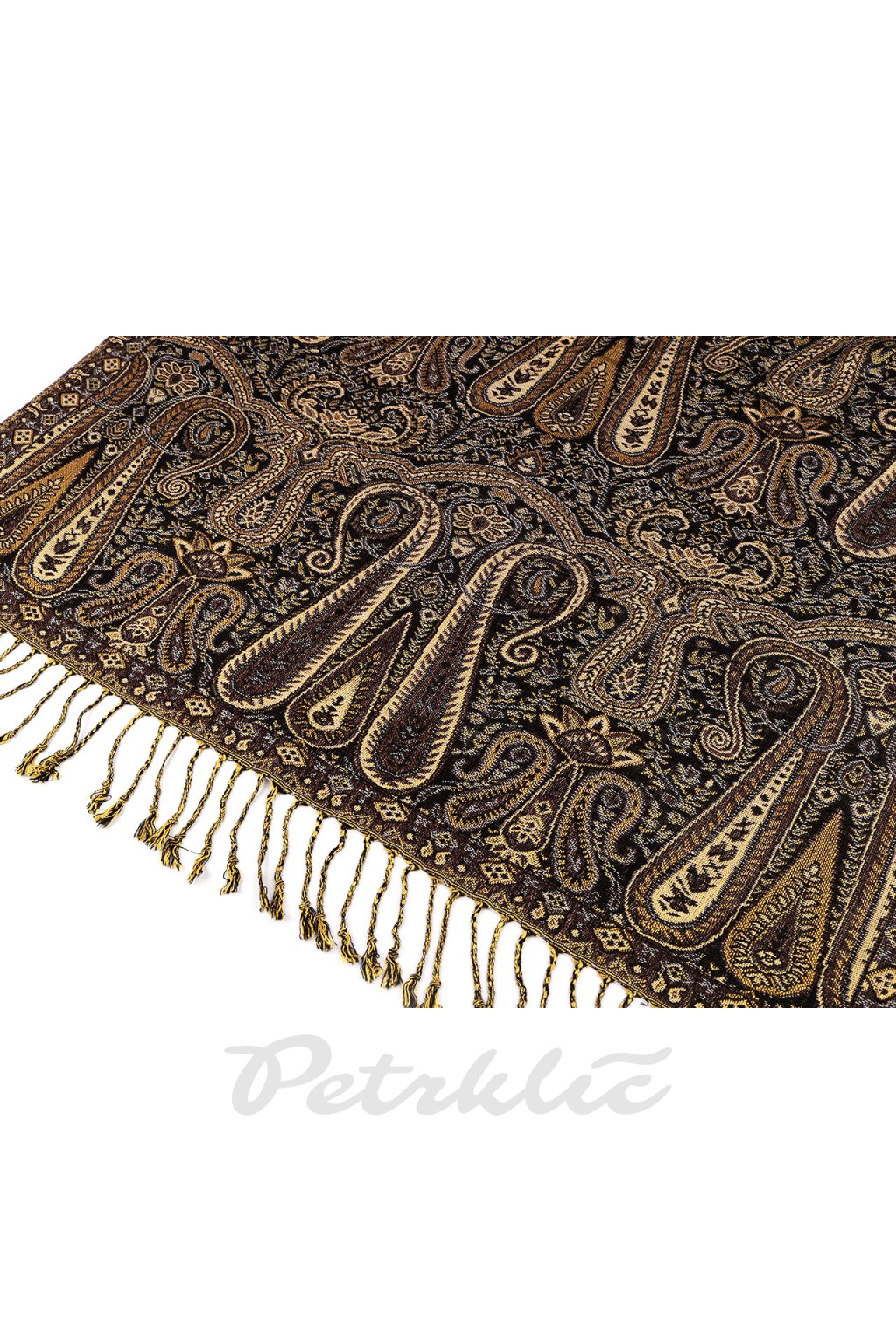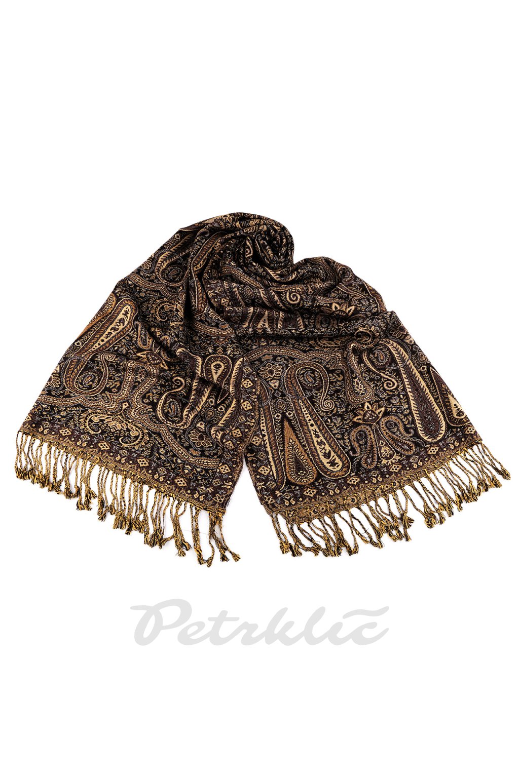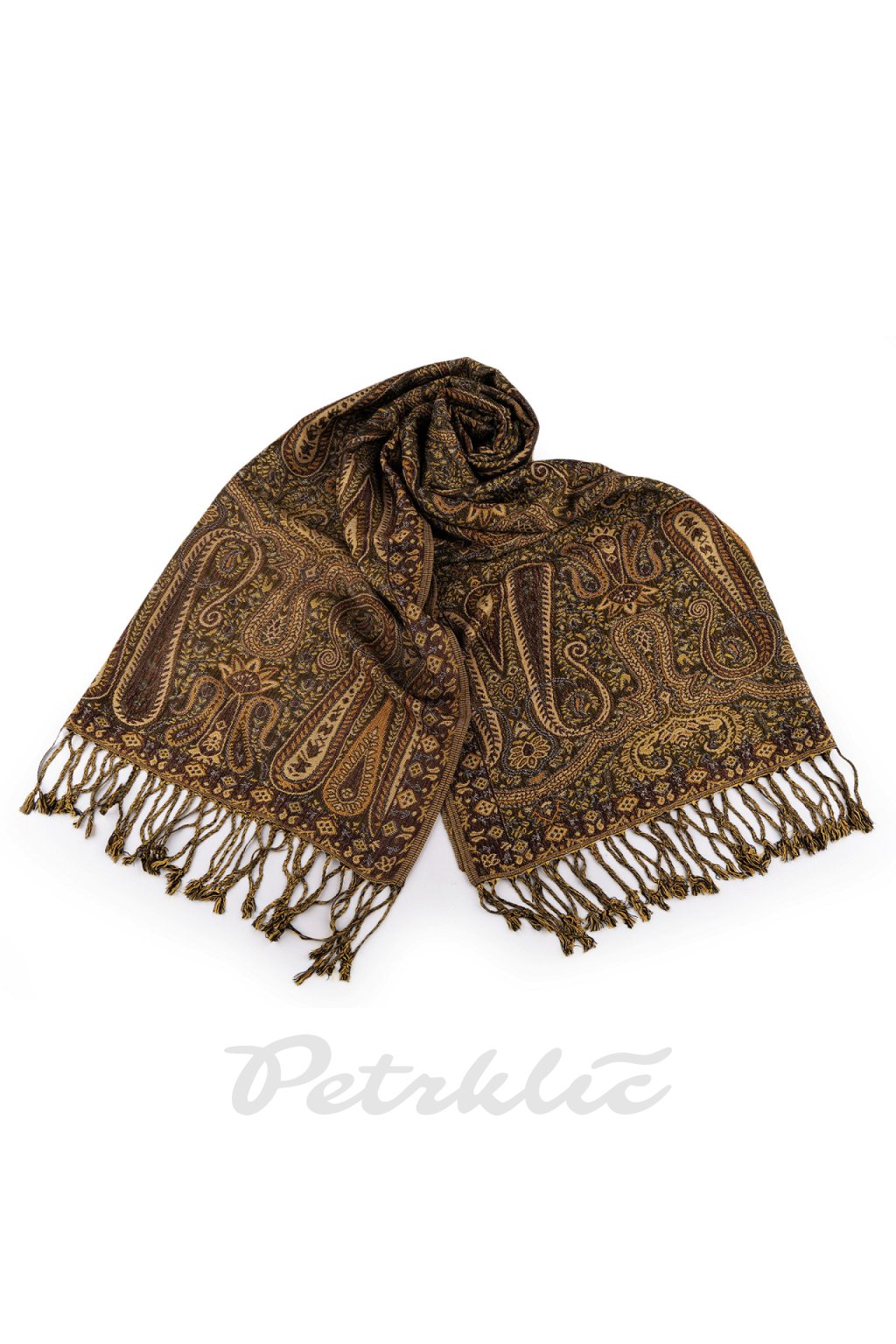 Elegantní šátek s orientálním vzorem vás okouzlí na pohled i dotek. Je oboustranný, jedna strana je tmavá, druhá světlá. Šátek je příjemně hebký, oceníte jej celoročně na každý den. Můžete jej nosit do práce i do společnosti, jeho elegantní vzhled váš outfit dokonale dozdobí. Vzor na šátku vznikl tkaním díky preciznímu křížení barevných vláken. Konce šátku jsou ozdobené třásněmi.