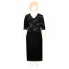 Rovné společenské šaty s tunikovými rukávy. V pase skrytá guma. Zdobný živůtek s hezkým mladistvým výstřihem je všitý do pevnější úpletové spodní části společně s pružnou gumkou. Šaty jsou díky tomuto řešení nad pasem lehce "podkasány". Střih dobře skryje nedokonalosti postavy. Nejlépe sluší ženám s rovnou, jen mírně a nebo hůře tvarovanou postavou. Skryjí i menší bříško. Šaty nejsou průsvitné.