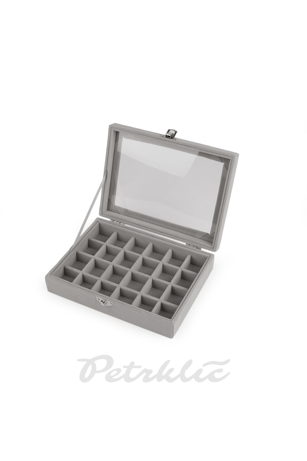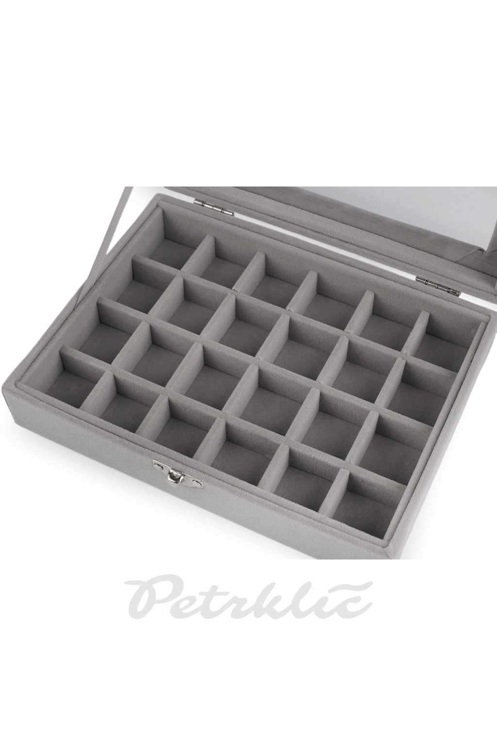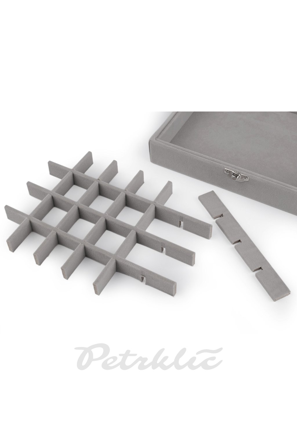 Vnitřní panel má přenastavitelné přepážky. Pokud používáte všechny najednou je ve šperkovnici 24 přihrádek o rozměrech 2,7 x 3 cm. Šperkovnice má velice kvalitní a precizní provedení.