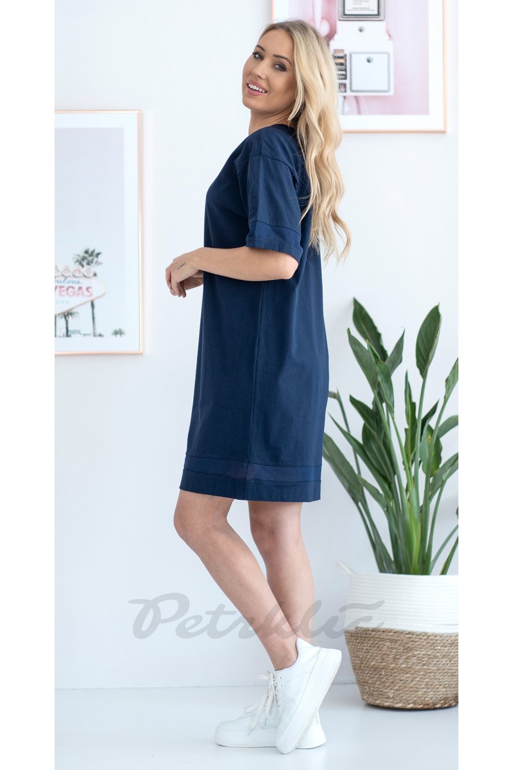 Sportovní volné šaty z tenkého a pružného bavlněného úpletu. Skvěle se hodí k teniskám. Sportovní charakter šatů podtrhují elegantní vsadky na rukávech, spodní části šatů a ve výstřihu.