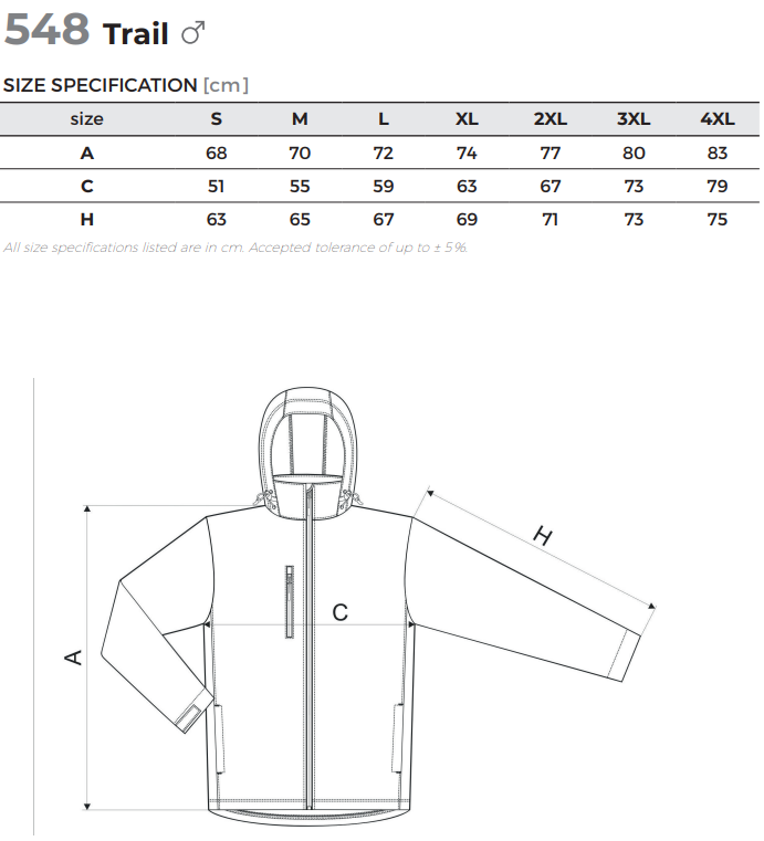 2vrstvý softshell, rovný střih s bočními díly, celopropínací reverzní spirálový zip s krytkou brady, kapuce a dolní lem na stažení elastickou šňůrkou, neutrální velikostní štítek v boční části průkrčníku, lemy rukávů nastavitelné suchým zipem, kapsy s reverzním spirálovým zipem, náprsní kapsa, tvarovaný a mírně prodloužený zadní díl, vnitřní fleece s antipilingovou úpravou
