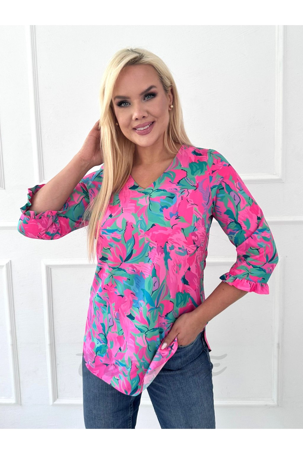 Ležérní tunika ze vzdušné viskózy s výstřihem do V. 3/4 rukávy lemované gumičkou, prsní záševky. Vzadu zapínání na slzu s kovovým knoflíkem. Tunika je dole zakončena kulatými rozparky. Materiál i šití je velmi kvalitní.