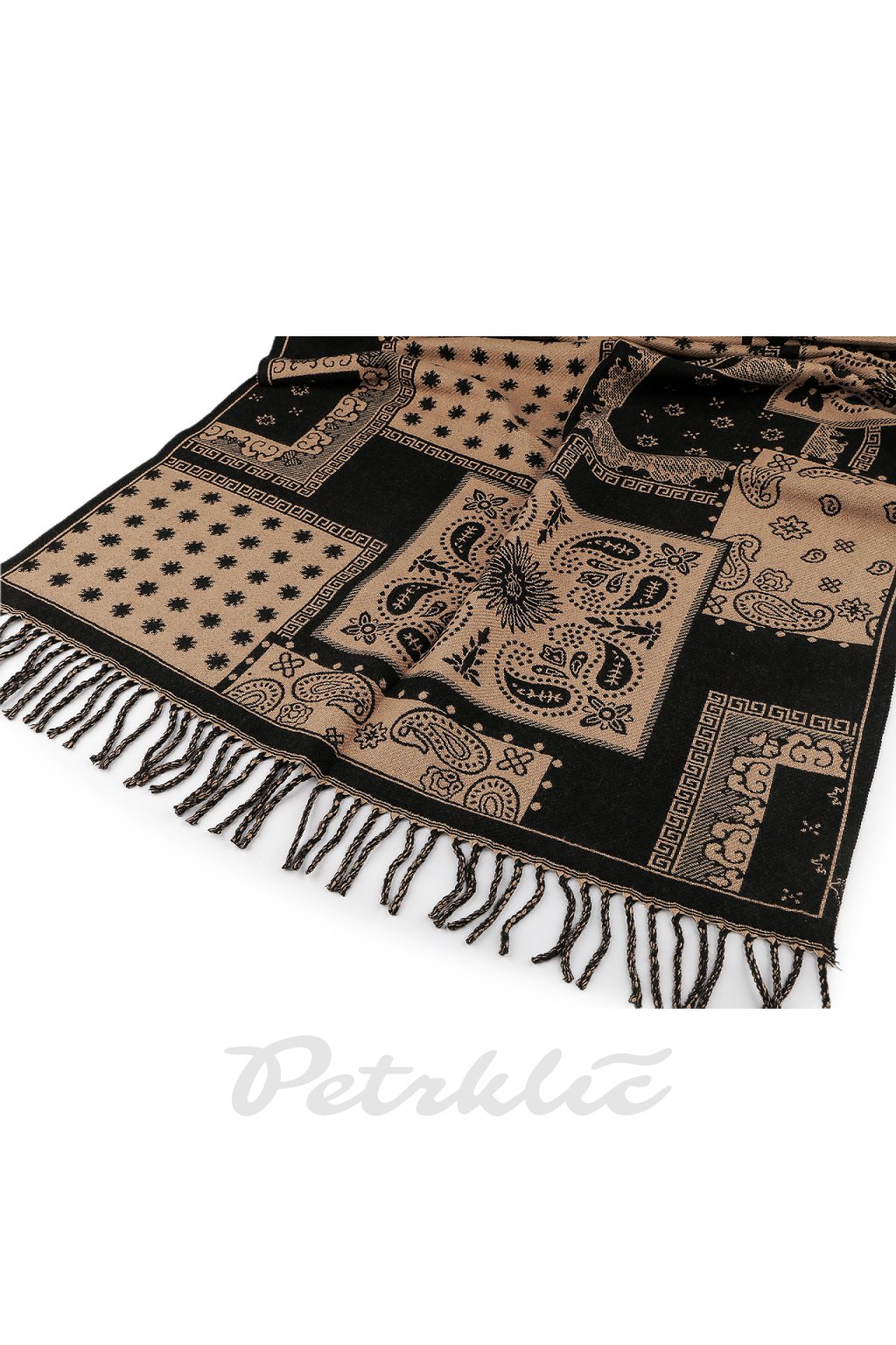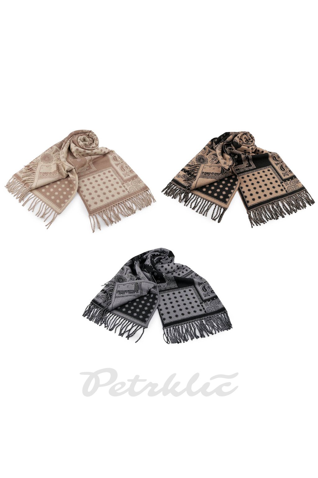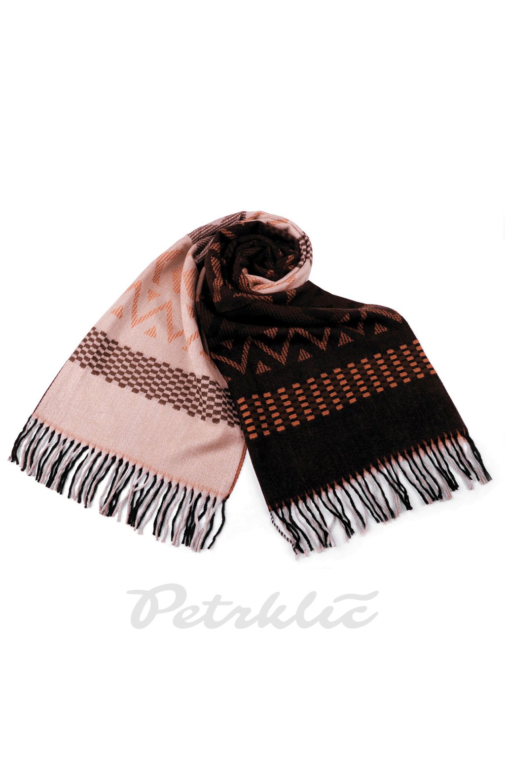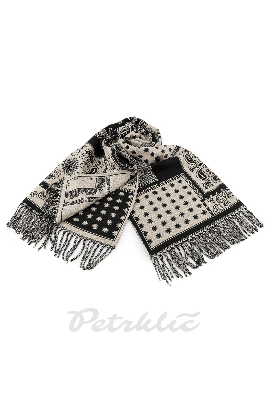 Oboustranná vzorovaná šála vás perfektně zahřeje v sychravých dnech. Je vyrobená z příjemně měkkého a jemného materiálu. Na koncích je zakončená dlouhými třásněmi.