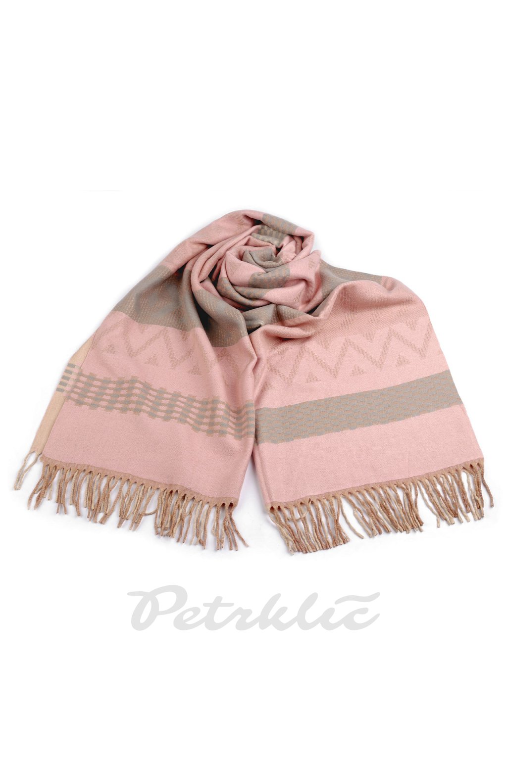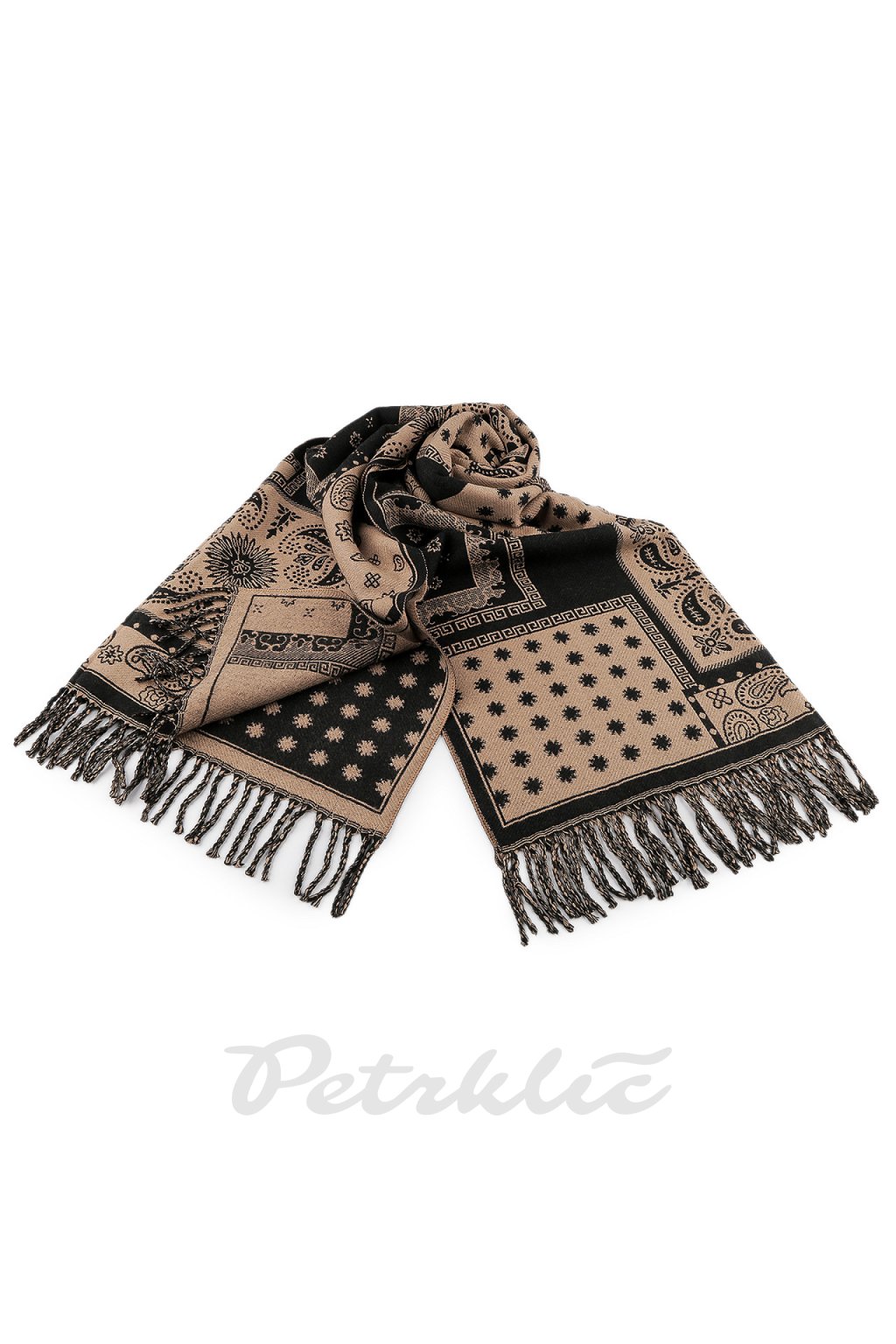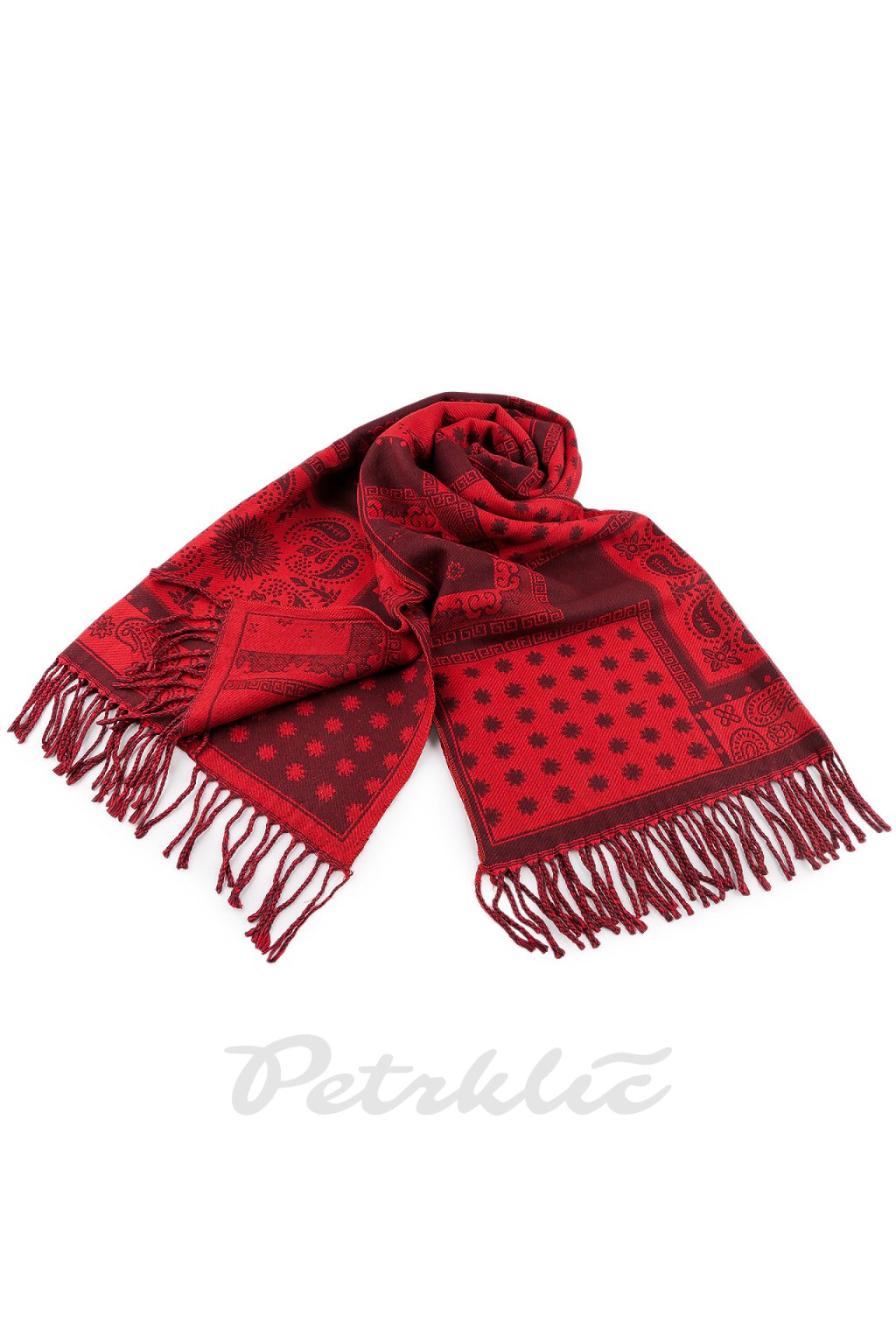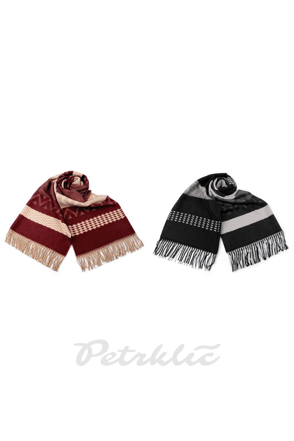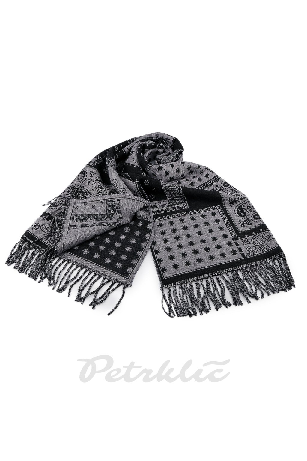 Oboustranná vzorovaná šála vás perfektně zahřeje v sychravých dnech. Je vyrobená z příjemně měkkého a jemného materiálu. Na koncích je zakončená dlouhými třásněmi.